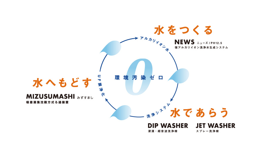 環境に配慮しながら、効率的な洗浄を実現するために、日伸精機は洗浄機だけではなく、洗浄水や浄化装置にも注目、理想的な循環洗浄システムを開発いたしました。