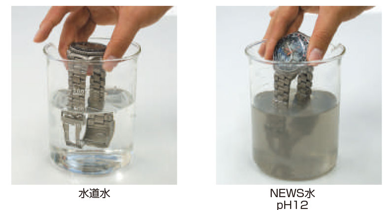 NEWS は、化学合成物質を含まず、人と環境と自然にやさしい強アルカリイオン水(pH12.5)を生成します。