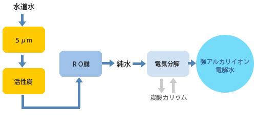 →不純物が少ない生成方式です。 - 原料は水道水と炭酸塩(炭酸カリウム)と電気のみ