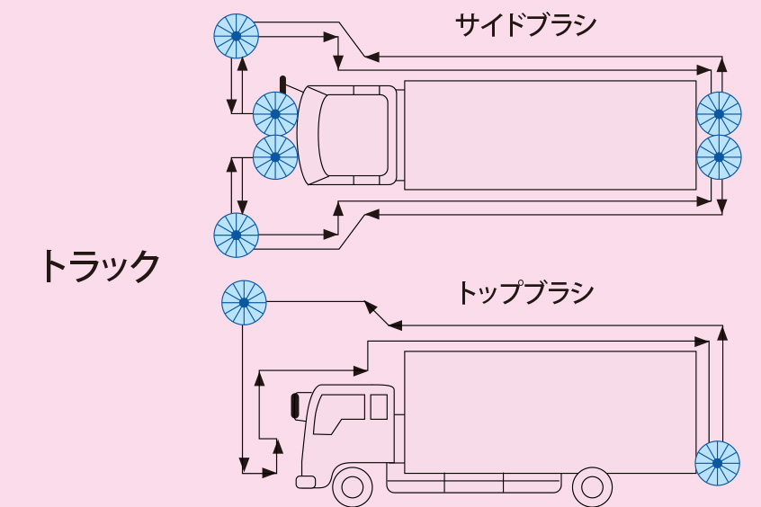 同車種が多い場合、車幅、車高に合わせてサイドブラシ、トップブラシの接触距離などを設定します。