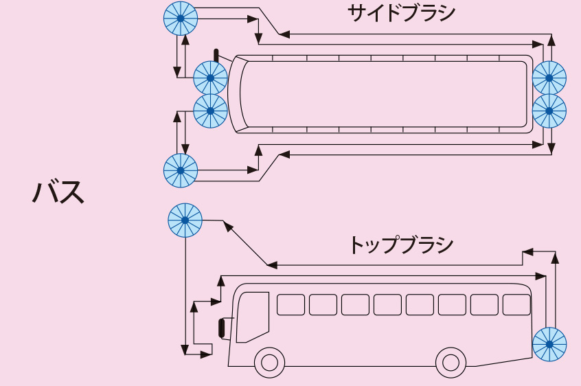 ボディーに対してサイドブラシ、トップブラシがインバーターシステムにより回転数、速度が変わり洗浄力を高めます。