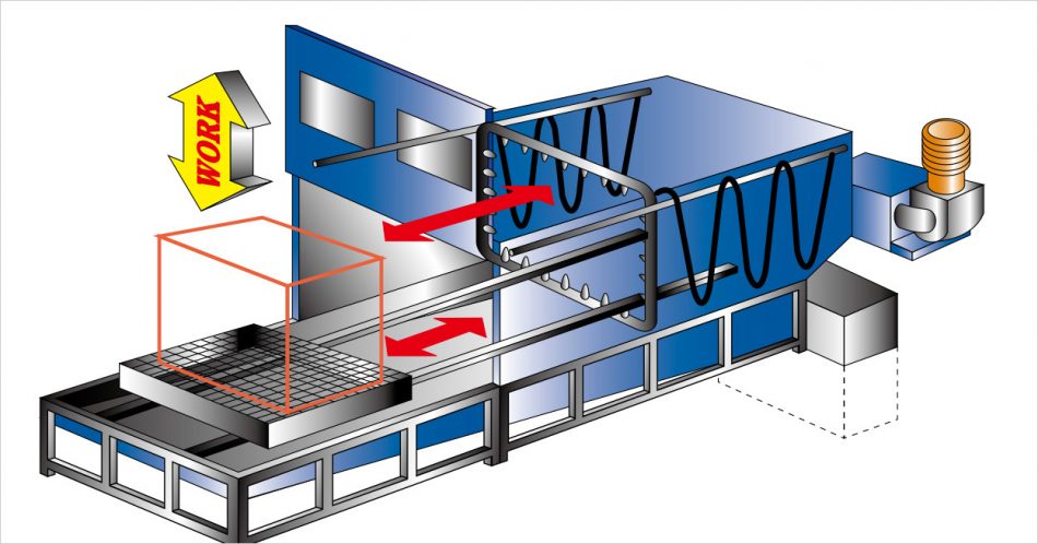 THE BIG SLIDERは、搬送台車上のワークに対して、アーチ型洗浄ノズルを水平に走行させて繰り返し往復洗浄を行う超大型・重量部品対応の洗浄マシンです。